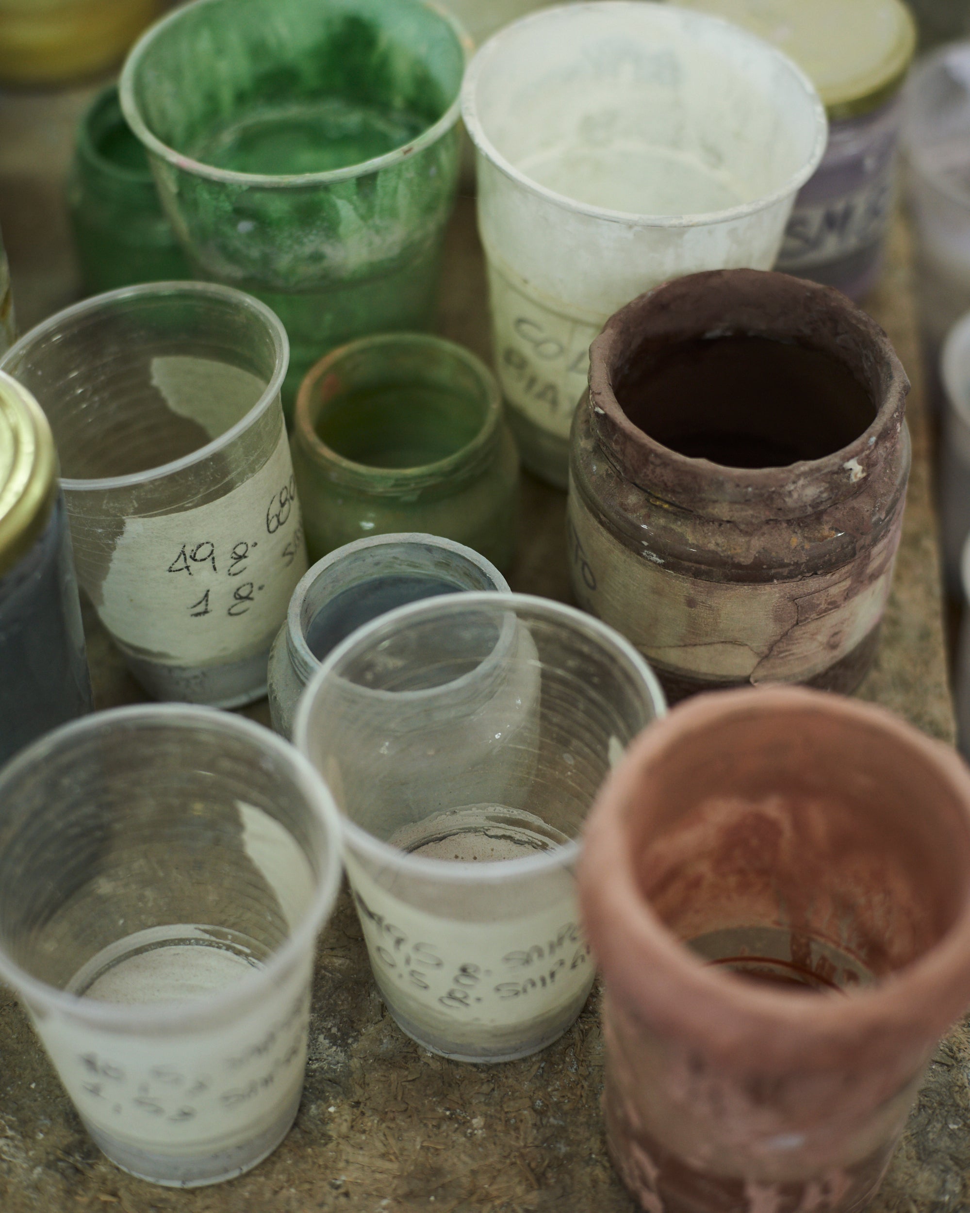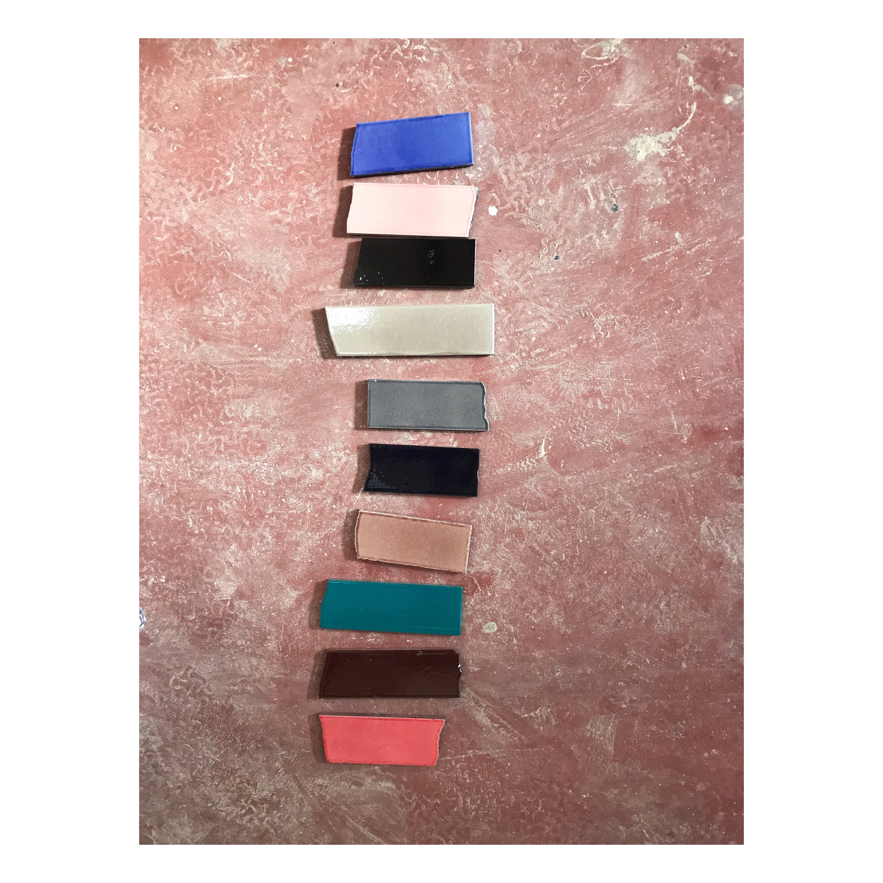 Ceramic glazes are made from a mix of silica, fluxes, and pigments — essentially, glaze is glass. At File Under Pop, we develop and mix our glazes in-house. Because color is such a fundamental part of our DNA, and because we want our paint and glaze palettes to complement each other, we create these blends ourselves. Once fired, the glaze melts into a glass-like surface that protects and enriches the tiles.”